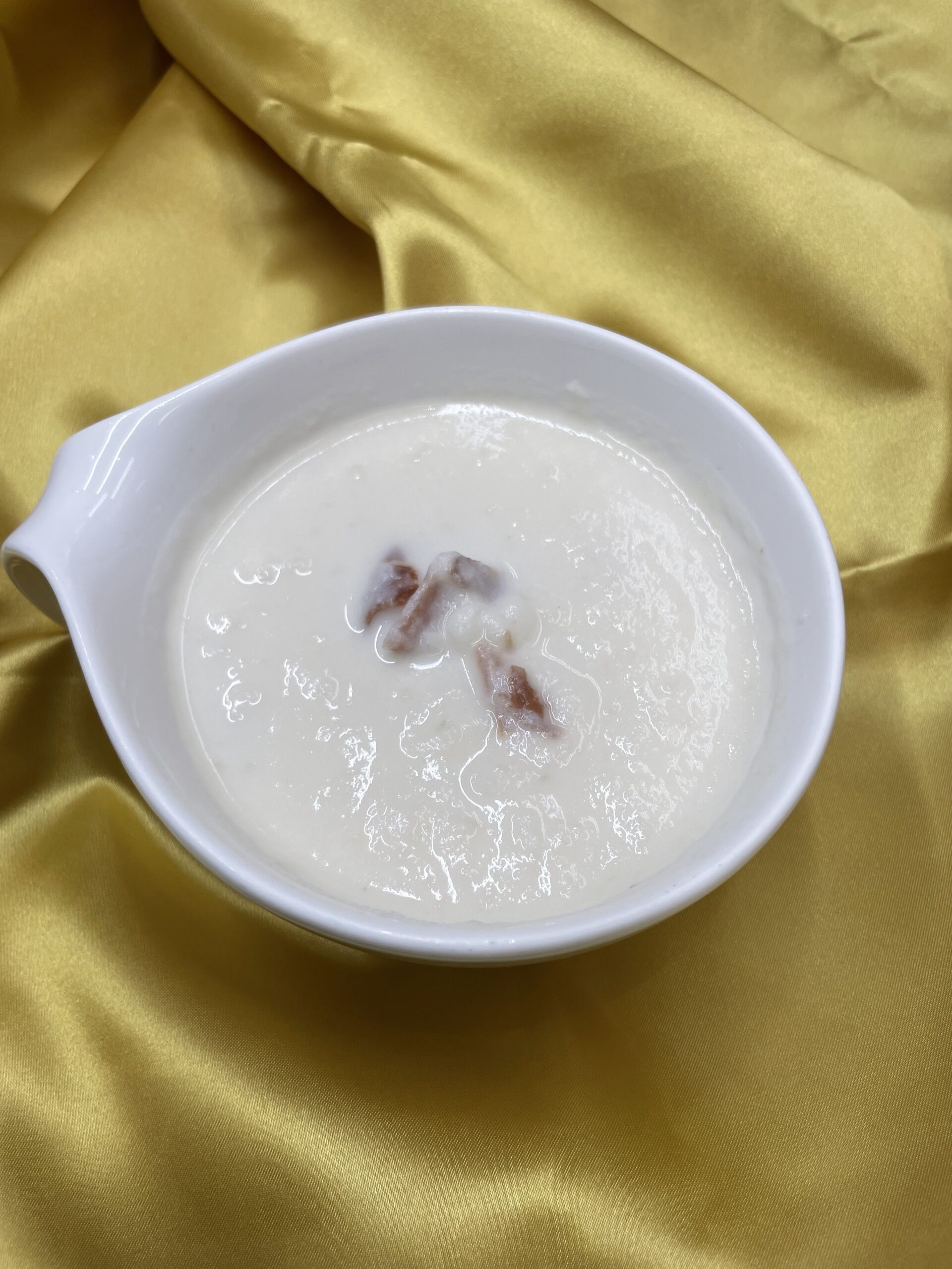 - 柔らかくなった大根をザルに上げ、湯を切り再び鍋に 戻して、牛乳を入れ、ハンドミキサーで攪拌し、(ハンドミキサーが無い場合は、大根・牛乳をミキサーに入れて 攪拌して鍋に入れてください)残りのカラダがよろこぶ 出汁・生ハムを入れ弱火で温め、グツグツ言い始めたら 完成。